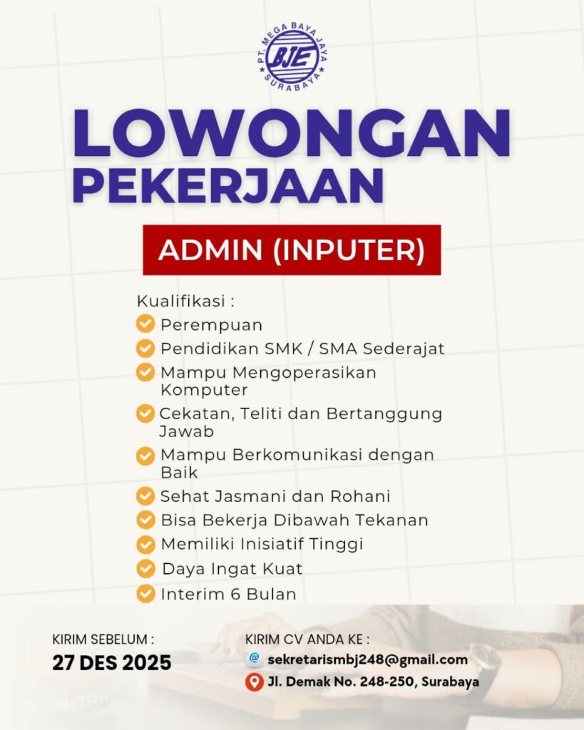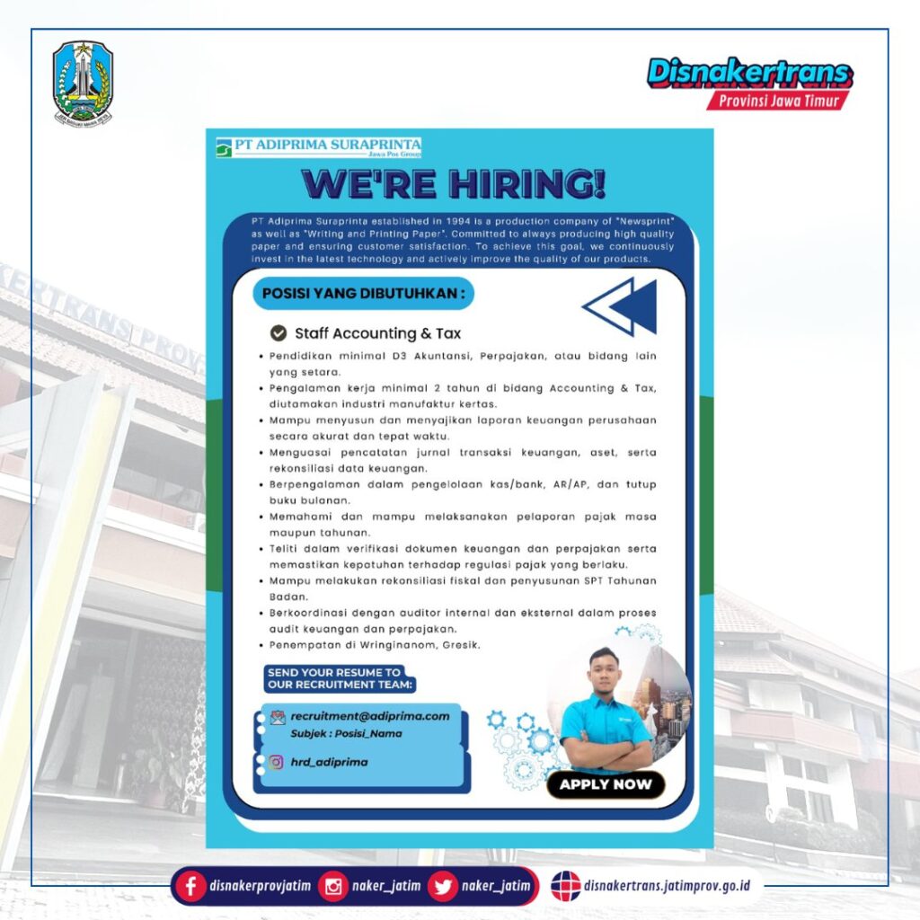 – Pendidikan minimal D3 Akuntansi, Perpajakan, atau bidang lain yang setara.