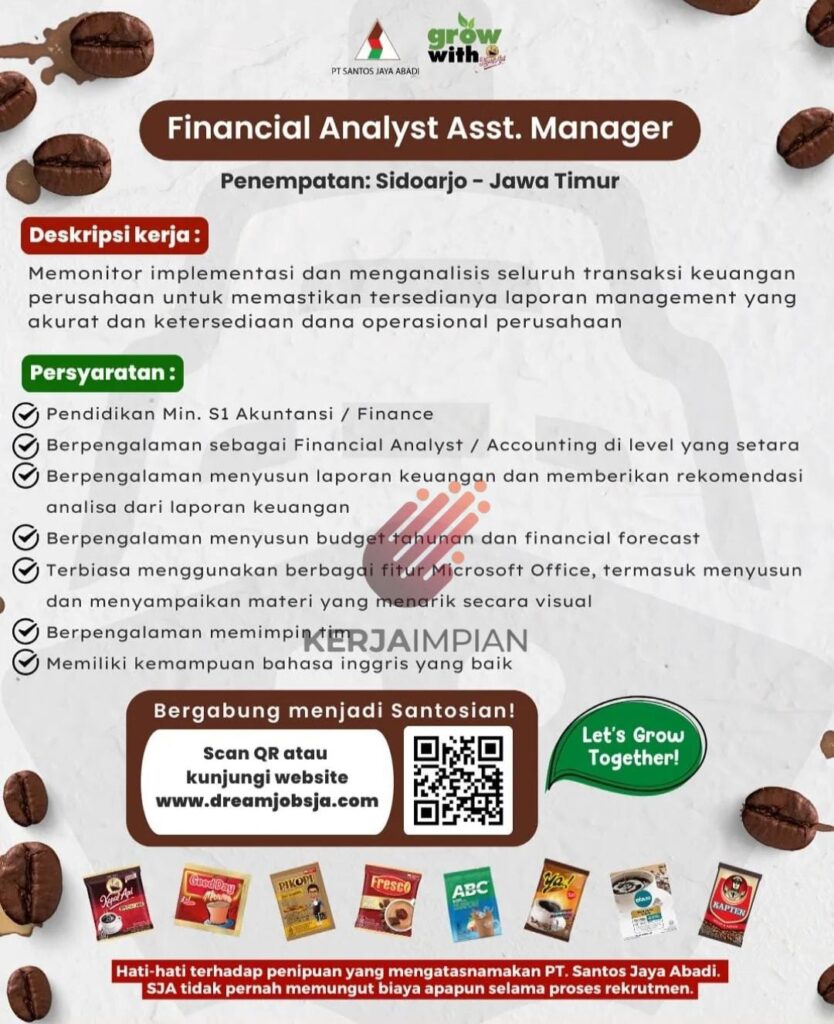 Financial Analyst Asst. ManagerPenempatan: Sidoarjo – Jawa TimurDeskripsi kerja:Memonitor implementasi dan menganalisis seluruh transaksi keuangan perusahaan untuk memastikan tersedianya laporan management yang akurat dan ketersediaan dana operasional perusahaanPersyaratan:Pendidikan Min. S1 Akuntansi / FinanceBerpengalaman sebagai Financial Analyst / Accounting di level yang setaraBerpengalaman menyusun laporan keuangan dan memberikan rekomendasi analisa dari laporan keuanganBerpengalaman menyusun budget tahunan dan financial forecastTerbiasa menggunakan berbagai fitur Microsoft Office, termasuk menyusun dan menyampaikan materi yang menarik secara visualBerpengalaman memimpi KERJAIMPIANMemiliki kemampuan bahasa inggris yang baikBergabung menjadi Santosian!Scan QR atau kunjungi website www.dreamjobsja.comLet’s Grow Together!PROPIFrescoABCKAPTENHati-hati terhadap penipuan yang mengatasnamakan PT. Santos Jaya Abadi. SJA tidak pernah memungut biaya apapun selama proses rekrutmen.