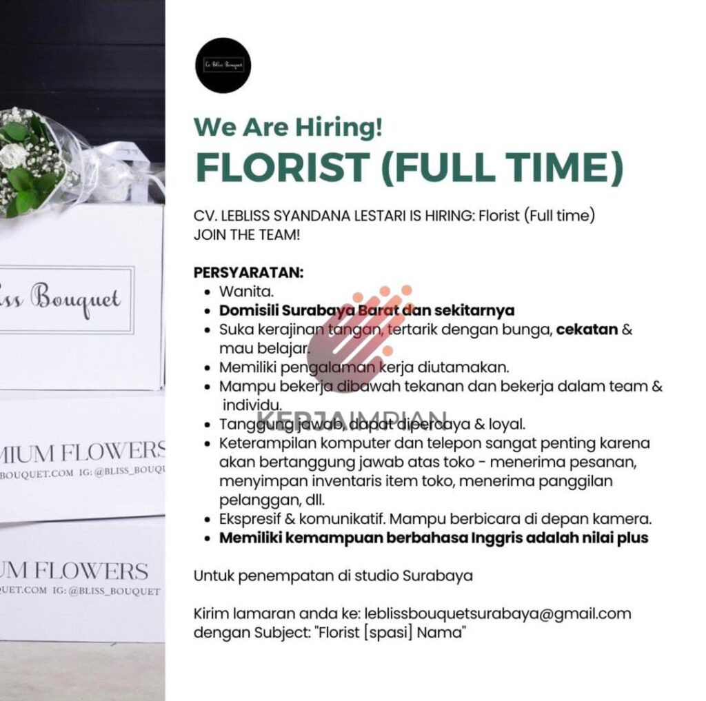 We Are Hiring! (FULL TIME)CV. LEBLISS SYANDANA LESTARI IS HIRING: Florist (Full time)JOIN THE TEAM!Ess BouquetPERSYARATAN:Wanita.Domisili Surabaya Barat dan sekitarnyaSuka kerajinan tangan, tertarik dengan bunga, cekatan & mau belajar.Memiliki pengalaman kerja diutamakan.Mampu bekerja dibawah tekanan dan bekerja dalam team & individu.MIUM FLOWERSBOUQUET.COM IG: @BLISS BOUQITanggung jawab, dapat dipercaya & loyal.Keterampilan komputer dan telepon sangat penting karena akan bertanggung jawab atas toko – menerima pesanan, menyimpan inventaris item toko, menerima panggilan pelanggan, dll.Ekspresif & komunikatif. Mampu berbicara di depan kamera.Memiliki kemampuan berbahasa Inggris adalah nilai plusUntuk penempatan di studio SurabayaKirim lamaran anda ke: [email protected] dengan Subject: “Florist [spasi] Nama”UM FLOWERS UET.COM IG:@BLISS_BOUQUET