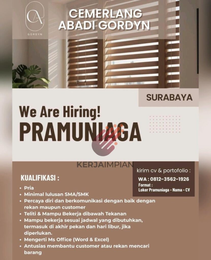 GORDYNSURABAYAWe Are Hiring!PRAMUNIAGAKERJAIMPIANKUALIFIKASI:PriaMinimal lulusan SMA/SMKkirim cv & portofolio:WA: 0812-3562-1926Format:Loker Pramuniaga – Nama – CVPercaya diri dan berkomunikasi dengan baik dengan rekan maupun customerTeliti & Mampu Bekerja dibawah TekananMampu bekerja sesuai jadwal yang dibutuhkan, termasuk di akhir pekan dan hari libur, jika diperlukan.Mengerti Ms Office (Word & Excel)Antusias membantu customer atau rekan mencari barang