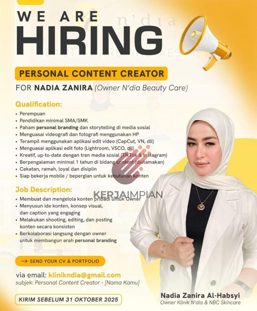 WE ARE na HIRING AESPERSONAL CONTENT CREATORFOR (Owner N’dia Beauty Care)Qualification:PerempuanPendidikan minimal SMA/SMKPaham personal branding dan storytelling di media sosialMenguasai videografi dan fotografi menggunakan HPTerampil menggunakan aplikasi edit video (CapCut, VN, dll)Menguasai aplikasi edit foto (Lightroom, VSCO, dll)Kreatif, up-to-date dengan tren media sosial (Tik Tok & Instagram)Berpengalaman minimal 1 tahun di bidang content (diutamakan)Cekatan, ramah, loyal dan disiplinSiap bekerja mobile / bepergian untuk kebutuhan kontenJob Description:KERTAIMPIANMembuat dan mengelola konten pribadi untuk OwnerMenyusun ide konten, konsep visual, dan caption yang engagingMelakukan shooting, editing, dan posting konten secara konsistenBerkolaborasi langsung dengan owneruntuk membangun arah personal branding→ SEND YOUR CV & PORTFOLIOvia email: [email protected]: Personal Content Creator – [Nama Kamu]KIRIM SEBELUM 31 OKTOBER 2025Nadia Zanira Al-Habsyi Owner Klinik N’dia & NBC Skincare