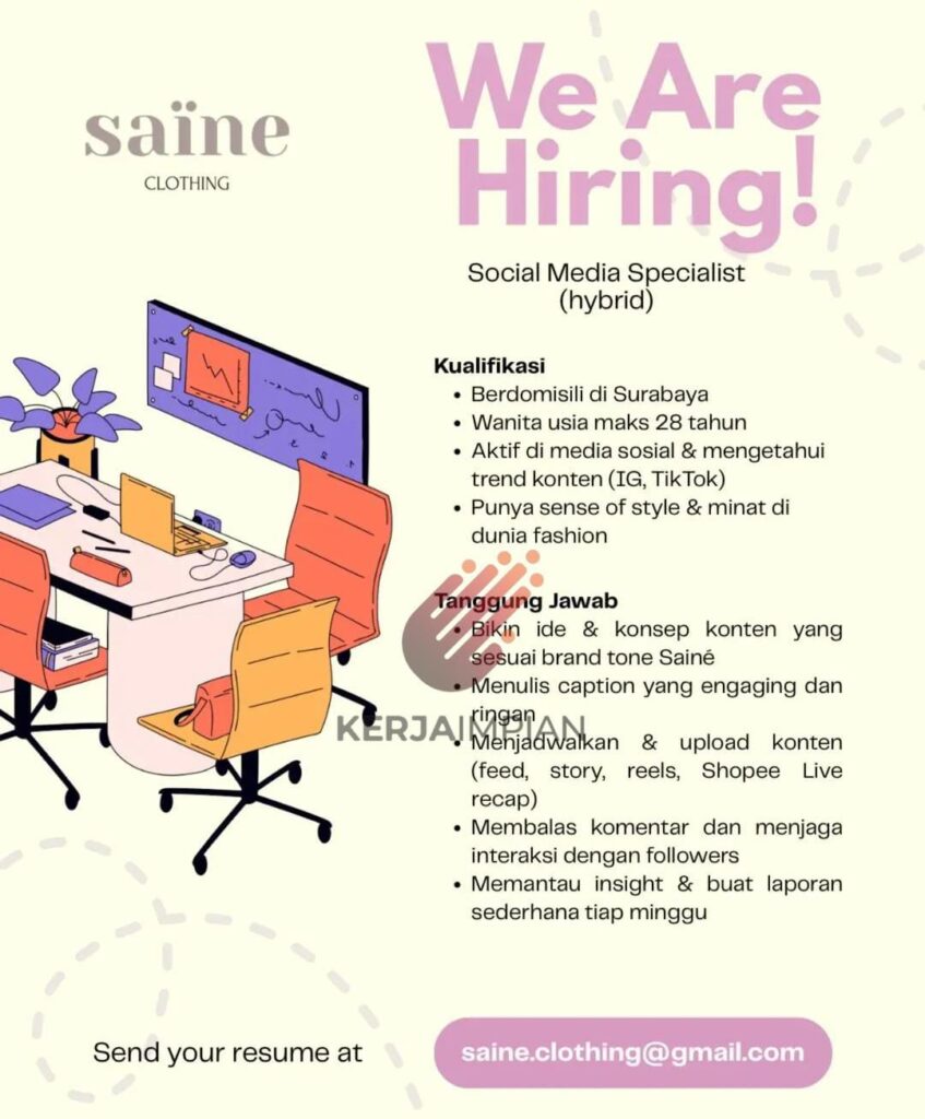 We Are Hiring!Social Media Specialist(hybrid)KualifikasiBerdomisili di SurabayaWanita usia maks 28 tahunAktif di media sosial & mengetahui trend konten (IG, Tik Tok)Punya sense of style & minat di dunia fashionTanggung JawabBikin ide & konsep konten yang sesuai brand tone SainéMenulis caption yang engaging danKERJAIMAalkan Menjadwalkan & upload konten(feed, story, reels, Shopee Live recap)Membalas komentar dan menjaga interaksi dengan followersMemantau insight & buat laporan sederhana tiap mingguSend your resume [email protected]