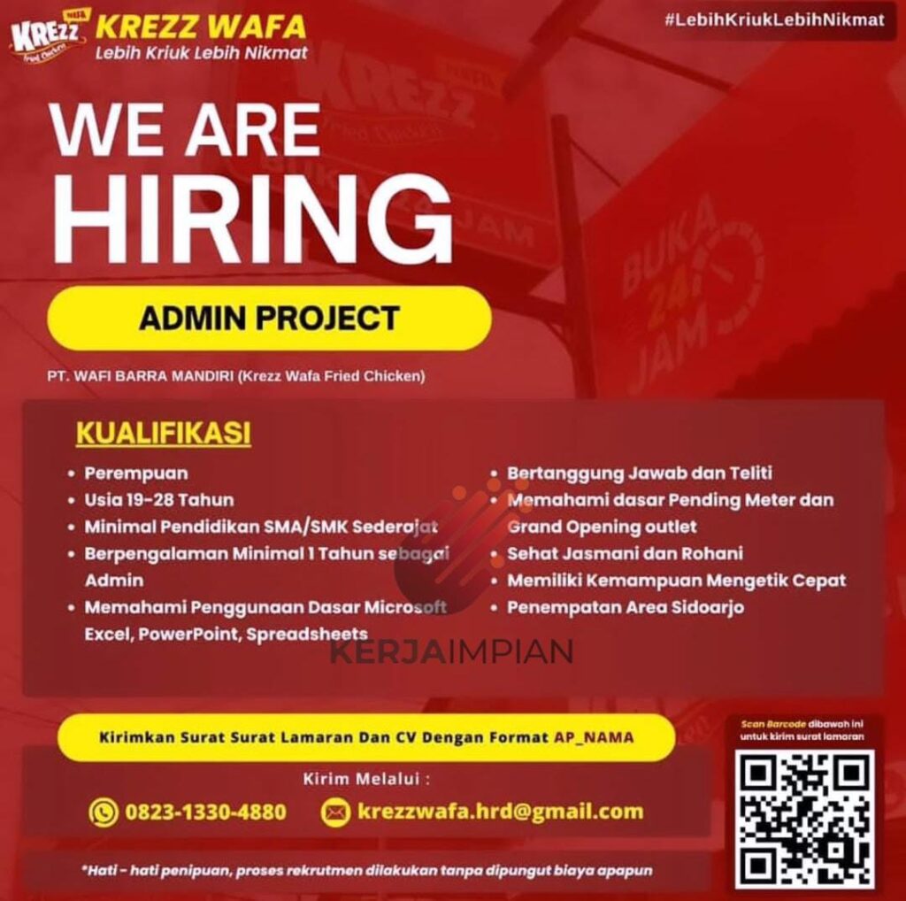 KREZZKREZZ WAFALebih Kriuk Lebih Nikmat#LebihKriukLebih NikmatREZZWE ARE HIRINGJAMADMIN PROJECTPT. WAFI BARRA MANDIRI (Krezz Wafa Fried Chicken)BUKA24JAMKUALIFIKASIPerempuanUsia 19-28 TahunMinimal Pendidikan SMA/SMK SederajatBerpengalaman Minimal 1 Tahun sebagai AdminMemahami Penggunaan Dasar Microsoft Excel, PowerPoint, SpreadsheetsBertanggung Jawab dan TelitiMemahami dasar Pending Meter dan Grand Opening outletSehat Jasmani dan RohaniMemiliki Kemampuan Mengetik CepatPenempatan Area SidoarjoKERJAIMPIANKirimkan Surat Surat Lamaran Dan CV Dengan Format AP_NAMAScan Barcode dibawah ini untuk kirim surat lamaran0823-1330-4880Kirim Melalui:[email protected]”Hati-hati penipuan, proses rekrutmen dilakukan tanpa dipungut biaya apapun