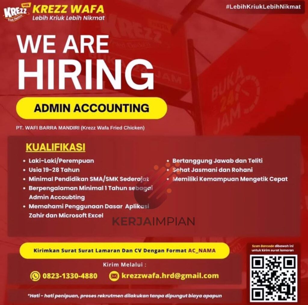 WAFALebih Kriuk Lebih Nikmat#LebihKriukLebih NikmatREZZWE ARE HIRINGJAMADMIN ACCOUNTINGPT. WAFI BARRA MANDIRI (Krezz Wafa Fried Chicken)BUKA241JAMKUALIFIKASILaki-Laki/PerempuanUsia 19-28 TahunMinimal Pendidikan SMA/SMK SederajatBerpengalaman Minimal 1 Tahun sebagaiAdmin AccoubtingMemahami Penggunaan Dasar AplikasiZahir dan Microsoft ExcelBertanggung Jawab dan TelitiSehat Jasmani dan RohaniMemiliki Kemampuan Mengetik CepatKERJAIMPIANKirimkan Surat Surat Lamaran Dan CV Dengan Format AC_NAMAScan Barcode dibawah ini untuk kirim surat lamaran0823-1330-4880Kirim Melalui:[email protected]*Hati-hati penipuan, proses rekrutmen dilakukan tanpa dipungut biaya apapun