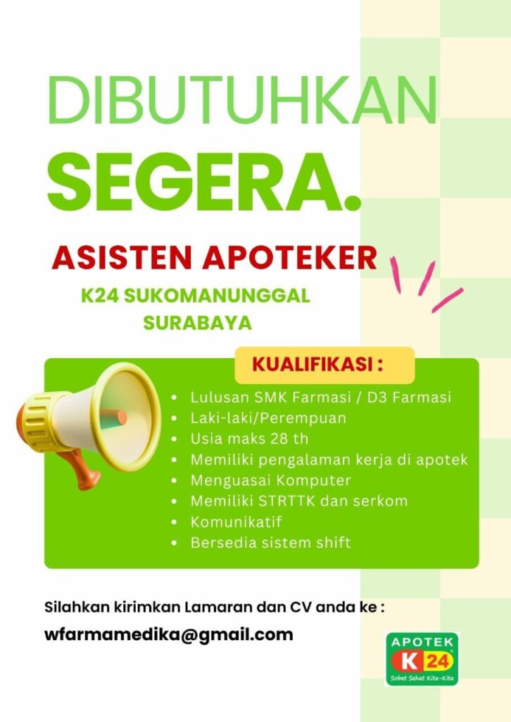 DIBUTUHKAN SEGERA.ASISTEN APOTEKERK24 SUKOMANUNGGAL SURABAYA.KUALIFIKASI:Lulusan SMK Farmasi / D3 FarmasiLaki-laki/Perempuan..Usia maks 28 thMemiliki pengalaman kerja di apotekMenguasai KomputerMemiliki STRTTK dan serkom. KomunikatifBersedia sistem shiftSilahkan kirimkan Lamaran dan CV anda ke: [email protected] 24Sobat Sehat Kita-Kita