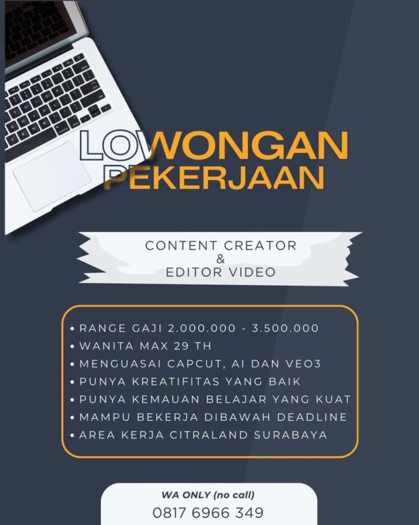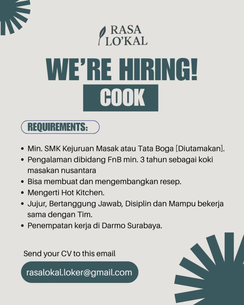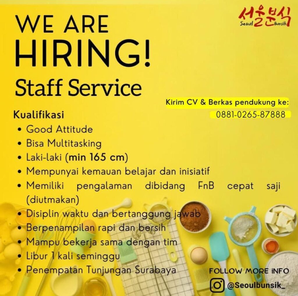 WE ARE HIRING!Staff Service BunsikKualifikasiKirim CV & Berkas pendukung ke:0881-0265-87888Good AttitudeBisa MultitaskingLaki-laki (min 165 cm)Mempunyai kemauan belajar dan inisiatifMemiliki pengalaman dibidang FnB cepat saji (diutmakan)Disiplin waktu dan bertanggung jawabBerpenampilan rapi dan bersihMampu bekerja sama dengan timLibur 1 kali semingguPenempatan Tunjungan SurabayaFOLLOW MORE INFO@Seoulbunsik_