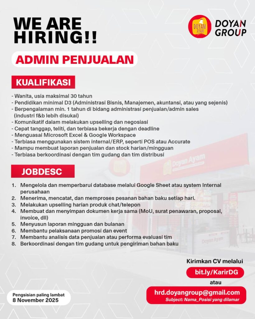 ADMIN PENJUALANKUALIFIKASI- Wanita, usia maksimal 30 tahun- Pendidikan minimal D3 (Administrasi Bisnis, Manajemen, akuntansi, atau yang sejenis)- Berpengalaman min. 1 tahun di bidang administrasi penjualan/admin sales (industri f&b lebih disukai)- Komunikatif dalam melakukan upselling dan negosiasi- Cepat tanggap, teliti, dan terbiasa bekerja dengan deadline- Menguasai Microsoft Excel & Google Workspace- Terbiasa menggunakan sistem internal/ERP, seperti POS atau Accurate- Mampu membuat laporan penjualan dan stock harian/mingguan- Terbiasa berkoordinasi dengan tim gudang dan tim distribusiDoyon AyamJOBDESC1. Mengelola dan memperbarui database melalui Google Sheet atau system Internal perusahaan2. Menerima, mencatat, dan memproses pesanan bahan baku setiap hari.3. Melakukan upselling harian produk chat/telepon4. Membuat dan menyimpan dokumen kerja sama (MoU, surat penawaran, proposal, invoice, dII)5. Menyusun laporan mingguan dan bulanan6. Membantu pelaksanaan promosi dan event7. Membantu analisis data penjualan atau performa evaluasi tim8. Berkoordinasi dengan tim gudang untuk pengiriman bahan bakuDoyesi AyamKirimkan CV melaluibit.ly/[email protected]: Nama_Posisi yang dilamarPengsisian paling lambat 8 November 2025
