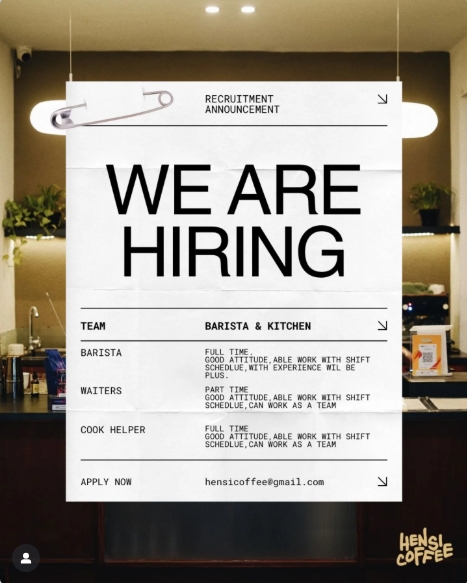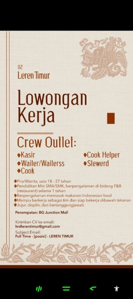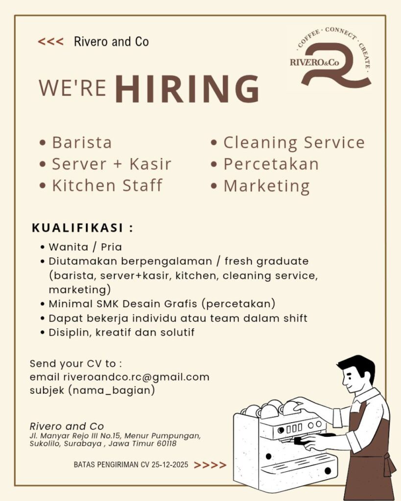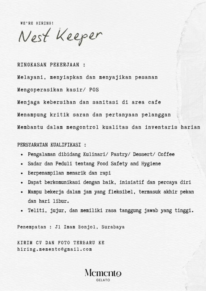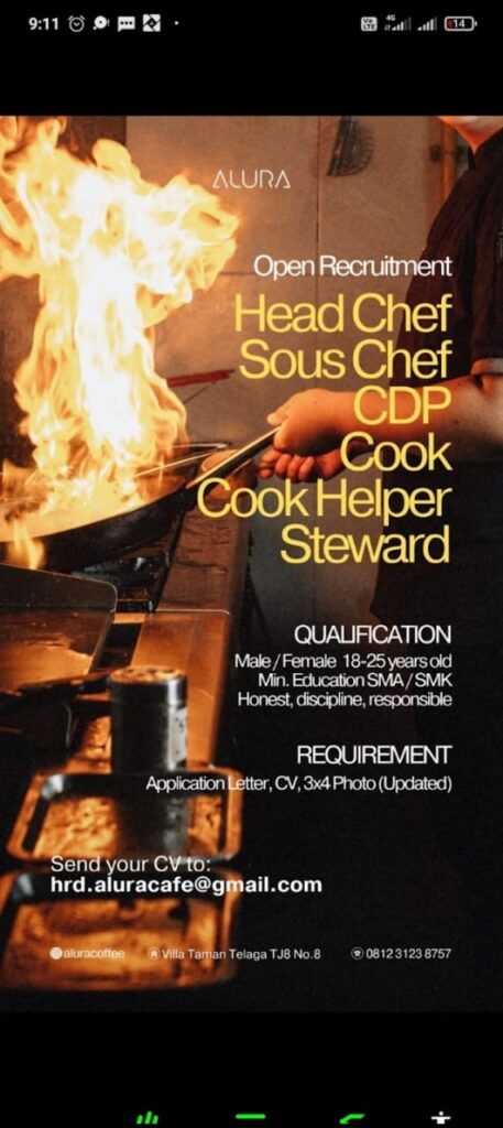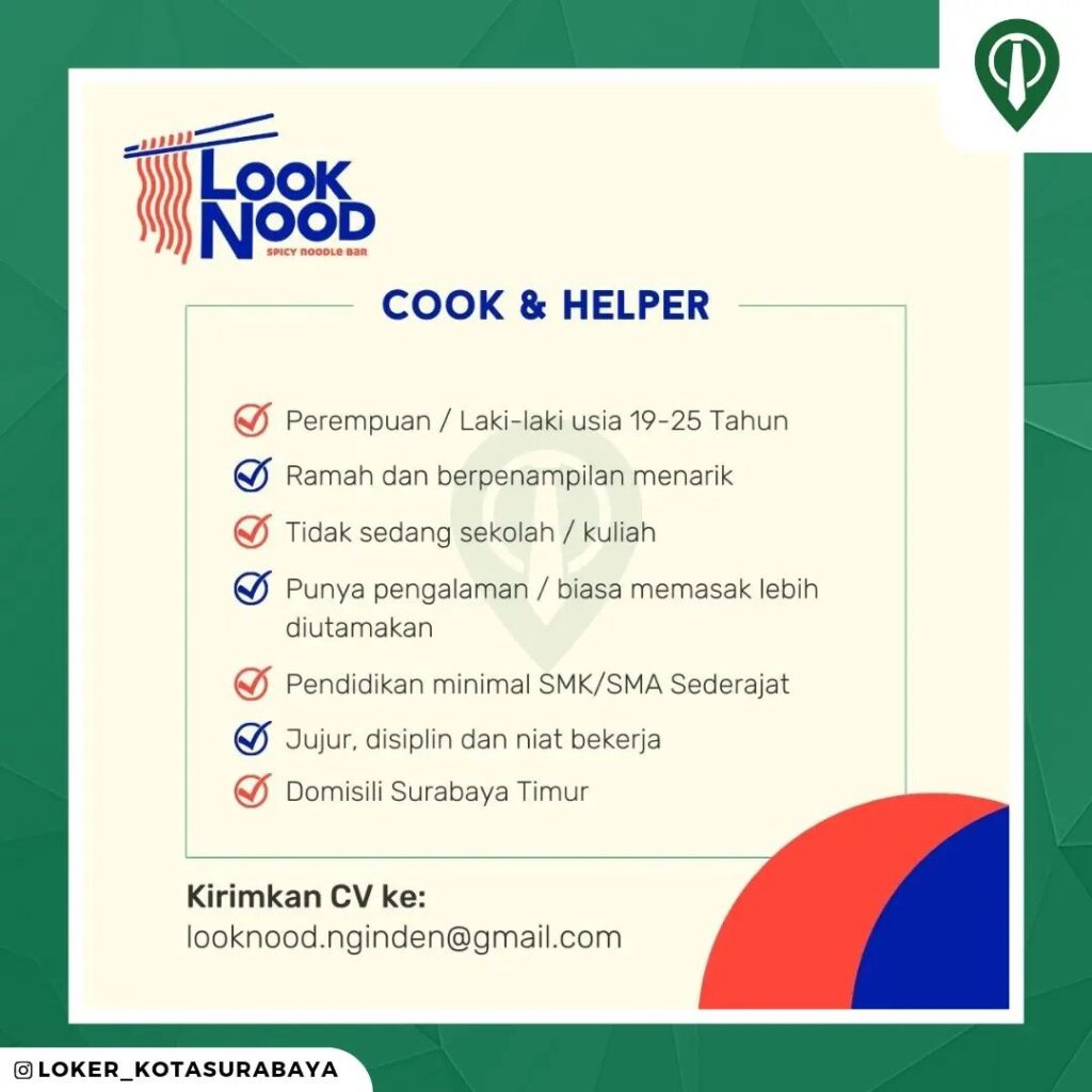 COOK & HELPER – Perempuan / Laki-laki usia 19-25 Tahun – Ramah dan berpenampilan menarik – Tidak sedang sekolah / kuliah – Punya pengalaman / biasa memasak lebih diutamakan – Pendidikan minimal SMK/SMA Sederajat – Jujur, disiplin dan niat bekerja – Domisili Surabaya Timur