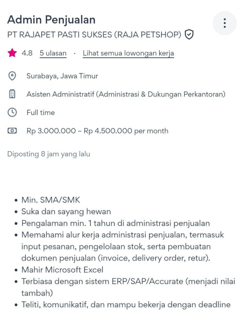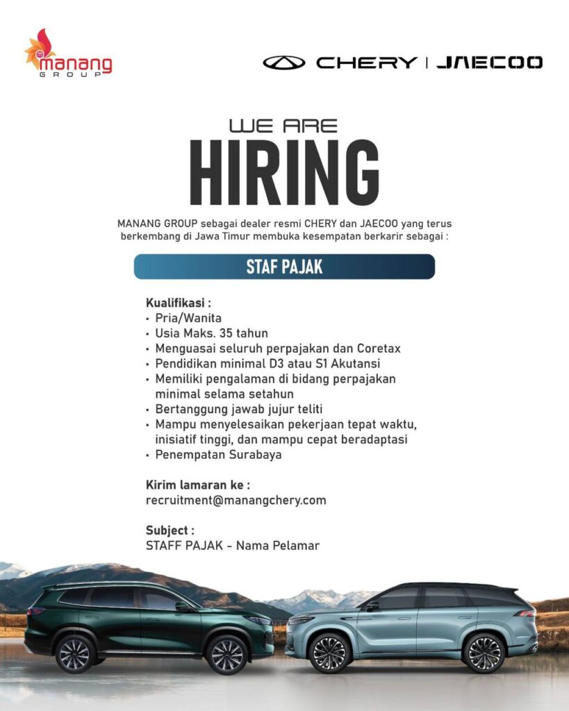 SYARAT & KETENTUAN: – SMK/SMA Segala Jurusan – Usia Maksimal 35 tahun – Bisa mengoperasikan MS Office – Teliti – Dapat Berkomunikasi dengan baik – Membuat Laporan Administrasi – Fresh Graduate boleh mendaftar