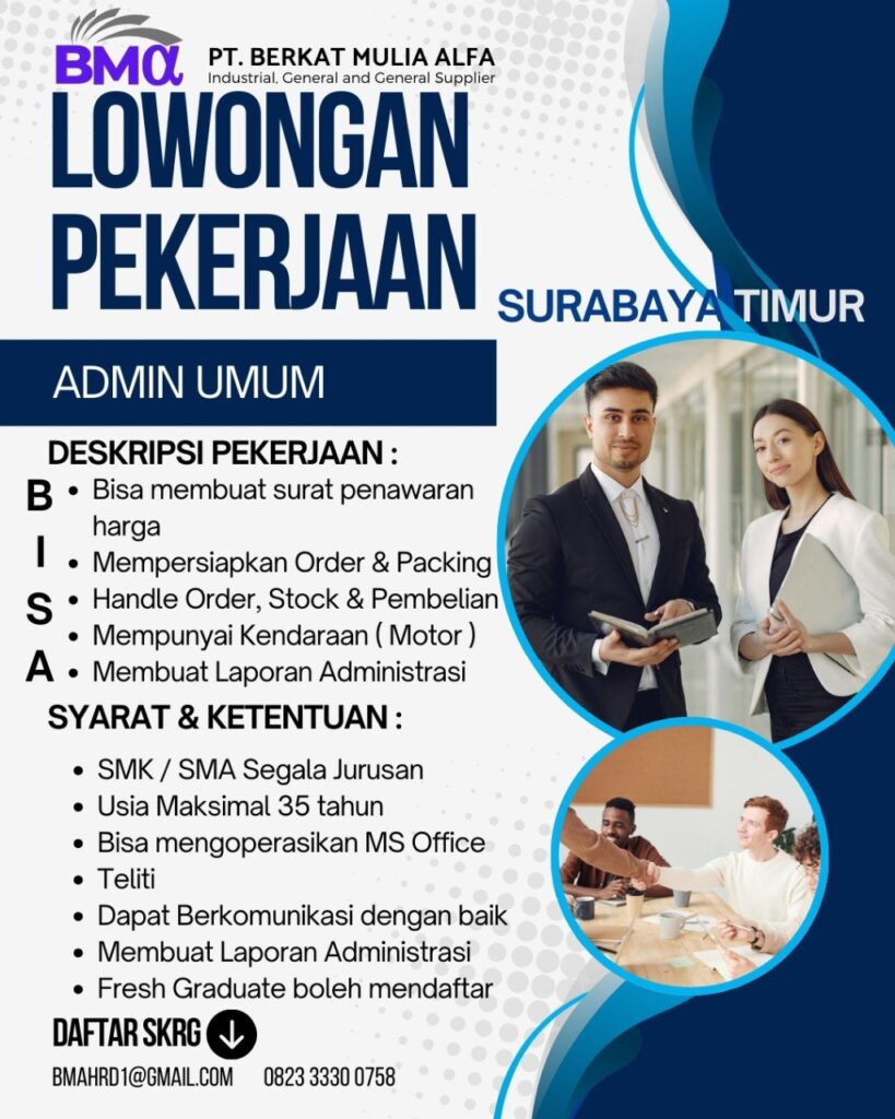 ADMIN UMUM DESKRIPSI PEKERJAAN: – Bisa membuat surat penawaran harga – Mempersiapkan Order & Packing – Handle Order, Stock & Pembelian – Mempunyai Kendaraan (Motor) – Membuat Laporan Administrasi