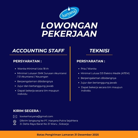 ACCOUNTING STAFF PERSYARATAN: – Wanita Minimal Usia 18 th – Minimal Lulusan SMK Jurusan Akuntansi /S1 Akuntansi / Keuangan – Berpengalaman dibidangnya – Jujur dan bertanggung jawab – Dapat bekerja secara tim maupun individu