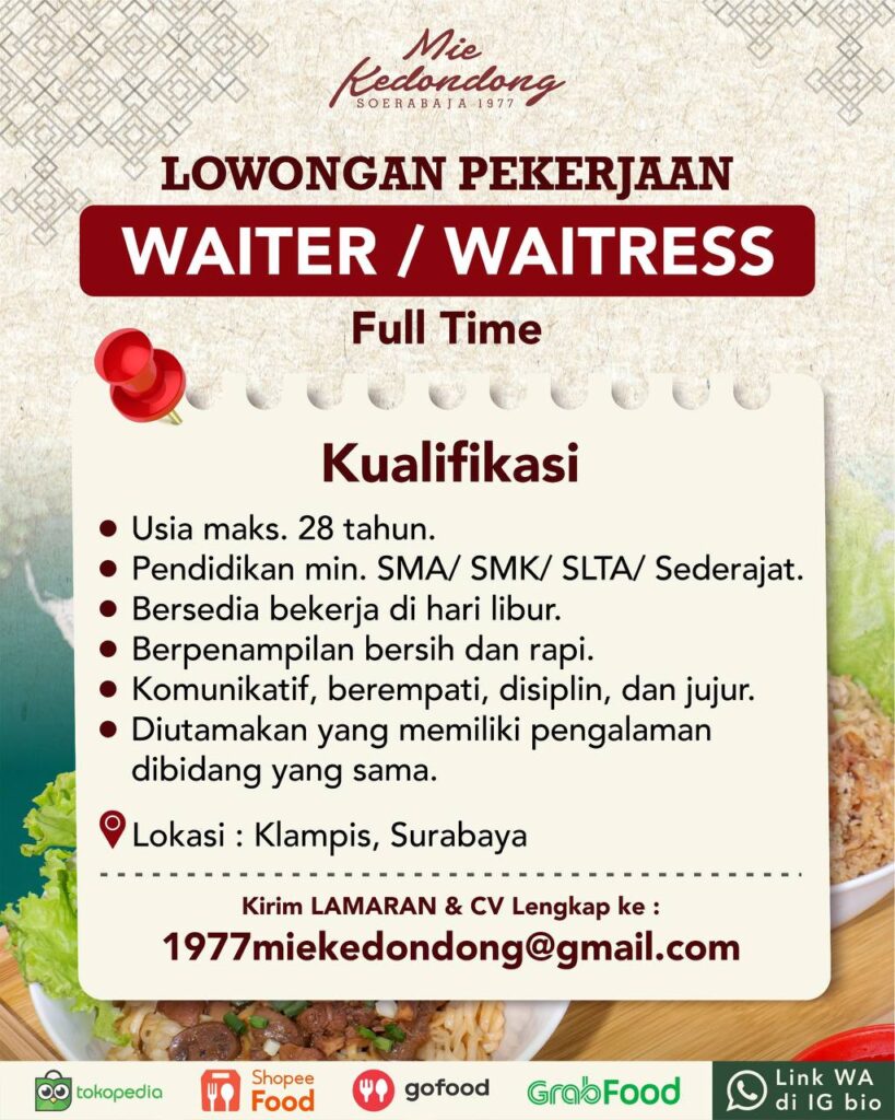 LOWONGAN PEKERJAAN WAITER / WAITRESS Full Time Kualifikasi – Usia maks. 28 tahun. – Pendidikan min. SMA/SMK/SLTA/ Sederajat. – Bersedia bekerja di hari libur. – Berpenampilan bersih dan rapi. – Komunikatif, berempati, disiplin, dan jujur. – Diutamakan yang memiliki pengalaman dibidang yang sama.