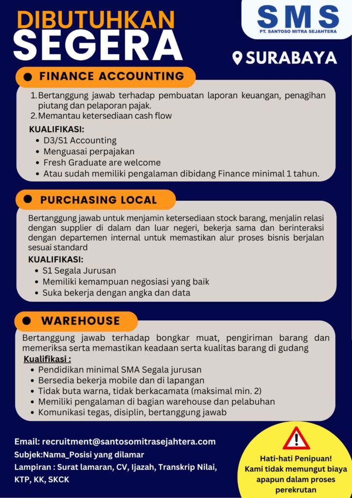 PERSYARATAN: – Pria & Wanita (20 – 25 tahun) – Min Pengalaman 2 Tahun – Teliti, Pintar, Cekatan, Fokus, & Problem Solver – Jujur, Disiplin & Tanggung Jawab – Mampu Mengoperasikan Word & Excel – Mudah beradaptasi & memiliki kemampuan komunikasi yang baik – Bersedia masuk tanggal merah & lembur – Mampu memecahkan masalah & multitasking