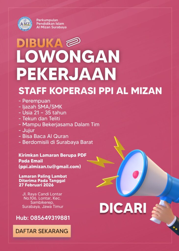DIBUKA LOWONGAN PEKERJAAN STAFF KOPERASI PPI AL MIZAN – Perempuan – Ijazah SMA/SMK – Usia 21-35 tahun – Tekun dan Teliti – Mampu Bekerjasama Dalam Tim – Jujur – Bisa Baca Al Quran – Berdomisili di Surabaya Barat