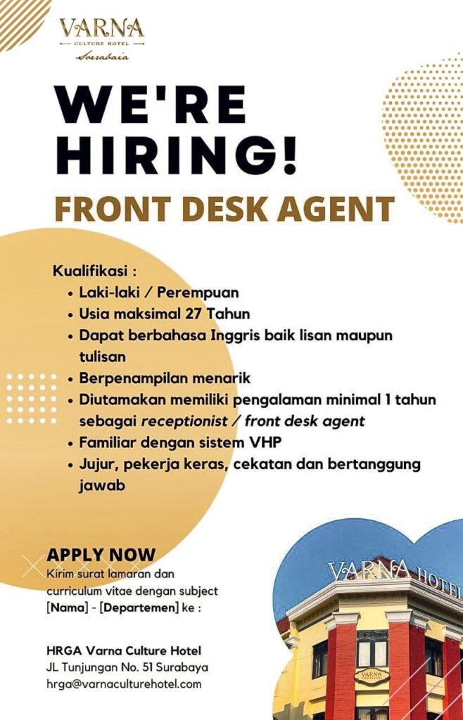 WE’RE HIRING! FRONT DESK AGENT Kualifikasi : – Laki-laki / Perempuan – Usia maksimal 27 Tahun – Dapat berbahasa Inggris baik lisan maupun tulisan – Berpenampilan menarik – Diutamakan memiliki pengalaman minimal 1 tahun sebagai receptionist / front desk agent – Familiar dengan sistem VHP – Jujur, pekerja keras, cekatan dan bertanggung jawab