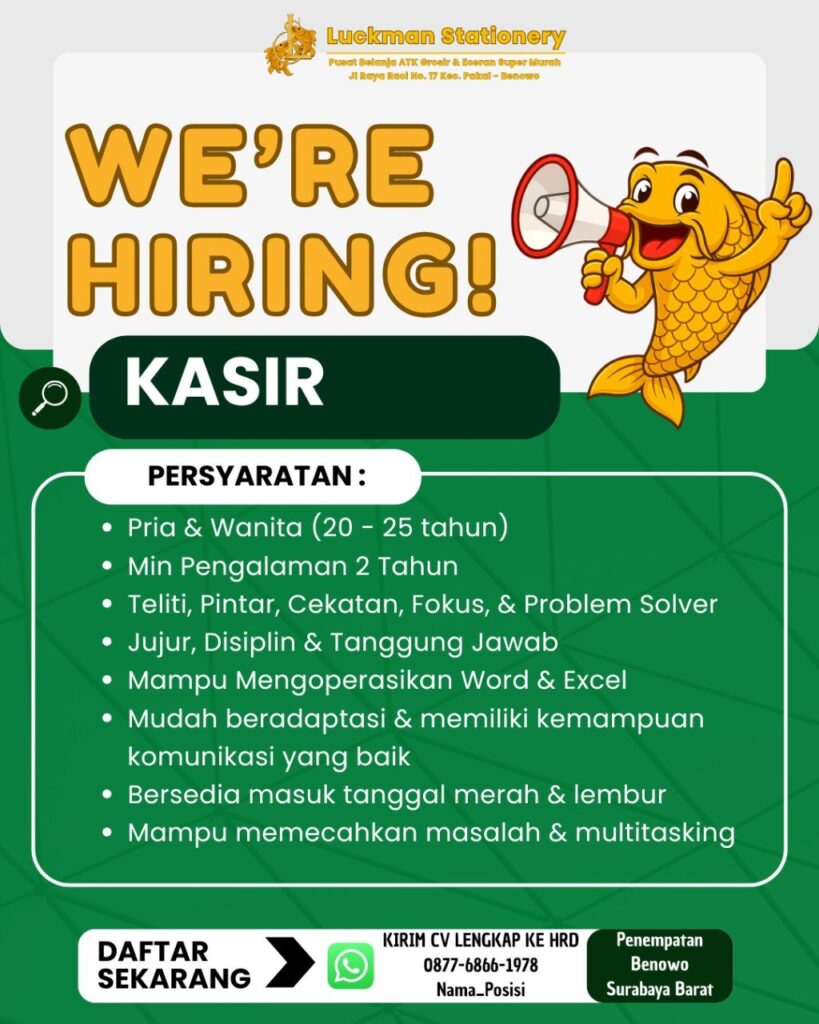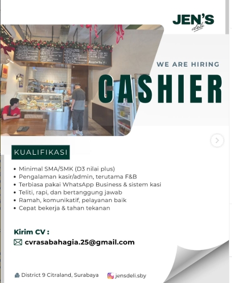 KUALIFIKASI – Minimal SMA/SMK (D3 nilai plus) – Pengalaman kasir/admin, terutama F&B – Terbiasa pakai WhatsApp Business & sistem kasi – Teliti, rapi, dan bertanggung jawab – Ramah, komunikatif, pelayanan baik – Cepat bekerja & tahan tekanan