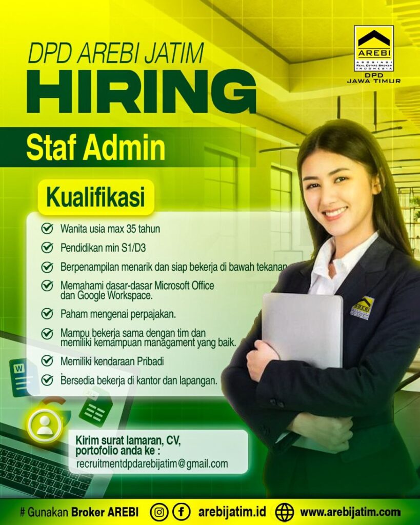 Staf Admin Kualifikasi – Wanita usia max 35 tahun – Pendidikan min S1/D3 – Berpenampilan menarik dan siap bekerja di bawah tekanan – Memahami dasar-dasar Microsoft Office dan Google Workspace. – Paham mengenai perpajakan. – Mampu bekerja sama dengan tim dan memiliki kemampuan manăgament yang baik. – Memiliki kendaraan Pribadi – Bersedia bekerja di kantor dan lapangan.