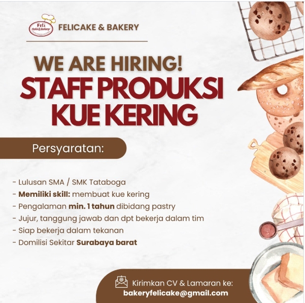 WE ARE HIRING! STAFF PRODUKSI KUE KERING Persyaratan: – Lulusan SMA/SMK Tataboga – Memiliki skill: membuat kue kering – Pengalaman min. 1 tahun dibidang pastry – Jujur, tanggung jawab dan dpt bekerja dalam tim – Siap bekerja dalam tekanan – Domilisi Sekitar Surabaya barat