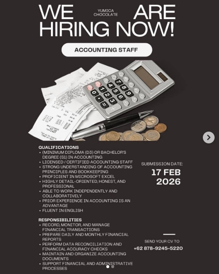 ACCOUNTING STAFF QUALIFICATIONS : – (MINIMUM DIPLOMA (D3) GELAR SARJANA (S1) DI BIDANG AKUNTANSI) – STAFF AKUNTANSI BERLISENSI/BERSERTIFIKASI – PEMAHAMAN YANG KUAT TENTANG PRINSIP-PRINSIP AKUNTANSI DAN PEMBUKUAN – MAHIR DALAM MICROSOFT EXCEL – SANGAT TELITI, JUJUR, DAN PROFESIONAL – MAMPU BEKERJA SECARA MANDIRI DAN KOLABORATIF – PENGALAMAN SEBELUMNYA DI BIDANG AKUNTANSI MERUPAKAN KEUNTUNGAN – FASIH BERBAHASA INGGRIS