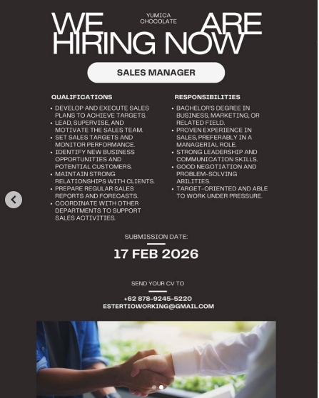 SALES MANAGER QUALIFICATIONS : – MENGEMBANGKAN DAN MELAKSANAKAN RENCANA PENJUALAN UNTUK MENCAPAI TARGET – MEMIMPIN, MENGAWASI, DAN MEMOTIVASI TIM PENJUALAN – MENETAPKAN TARGET PENJUALAN DAN MEMANTAU KINERJA – MENGIDENTIFIKASI PELUANG BISNIS BARU DAN PELANGGAN POTENSIAL – MEMELIHARA HUBUNGAN YANG KUAT DENGAN KLIEN – MENYIAPKAN LAPORAN DAN PERKIRAAN PENJUALAN SECARA TERATUR – BERKOORDINASI DENGAN DEPARTEMEN LAIN UNTUK MENDUKUNG KEGIATAN PENJUALAN