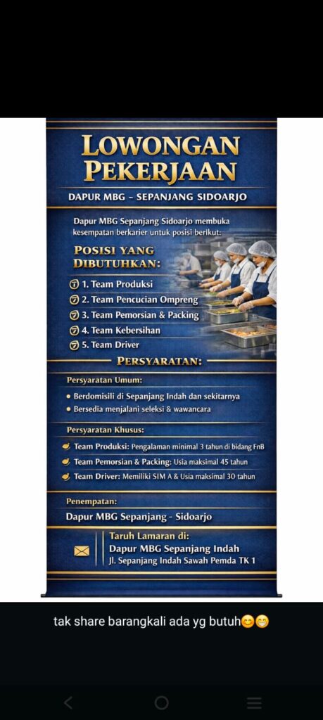 LOWONGAN PEKERJAAN DAPUR MBG – SEPANJANG SIDOARJO Dapur MBG Sepanjang Sidoarjo membuka kesempatan berkarier untuk posisi berikut: POSISI YANG DIBUTUHΚΑΝ: