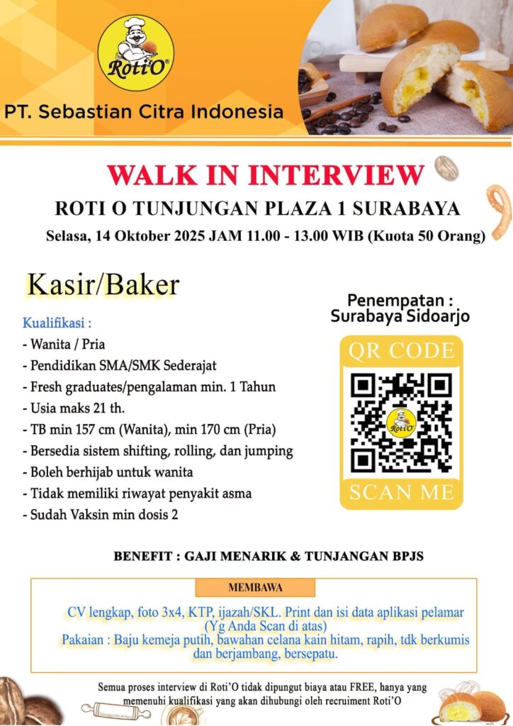 Semua proses interview di Roti’O tidak dipungut biaya atau FREE, hanya yang memenuhi kualifikasi yang akan dihubungi oleh recruiment Roti’O