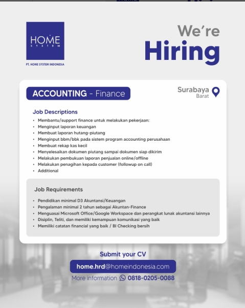 PT. HOME SYSTEM INDONESIA di Surabaya Barat sedang membuka lowongan pekerjaan untuk : Posisi: Accounting – Finance Lulusan: Min. D3 Akuntansi/Keuangan Pengalaman: Min. 2 tahun 📍 Lokasi: Surabaya Barat