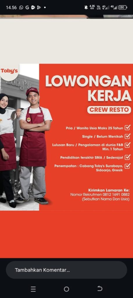 COOK & HELPER – Perempuan / Laki-laki usia 19-25 Tahun – Ramah dan berpenampilan menarik – Tidak sedang sekolah / kuliah – Punya pengalaman / biasa memasak lebih diutamakan – Pendidikan minimal SMK/SMA Sederajat – Jujur, disiplin dan niat bekerja – Domisili Surabaya Timur