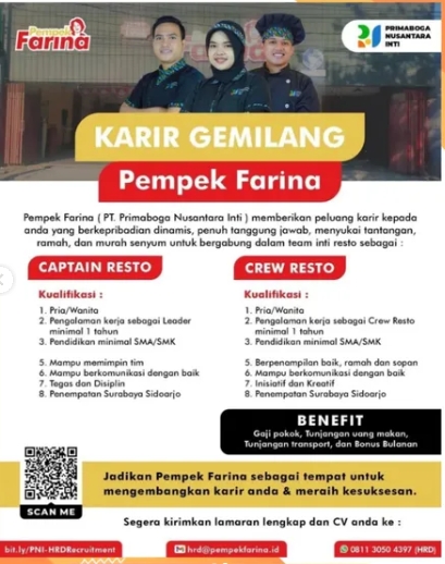 Pempek Farina (PT. Primaboga Nusantara Inti) memberikan peluang karir kepada anda yang berkepribadian dinamis, penuh tanggung jawab, menyukai tantangan, ramah, dan murah senyum untuk bergabung dalam team inti resto sebagai