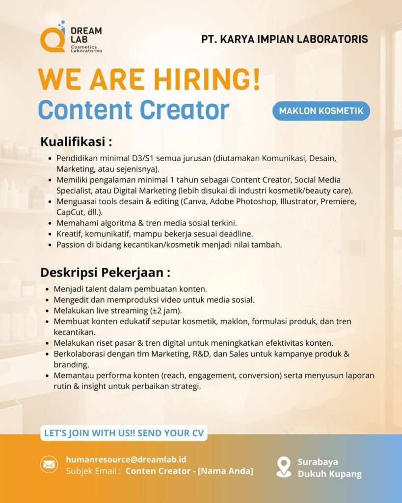 Memiliki pengalaman minimal 1 tahun sebagai Content Creator, Social Media Specialist, atau Digital Marketing (lebih disukai di industri kosmetik/beauty care).