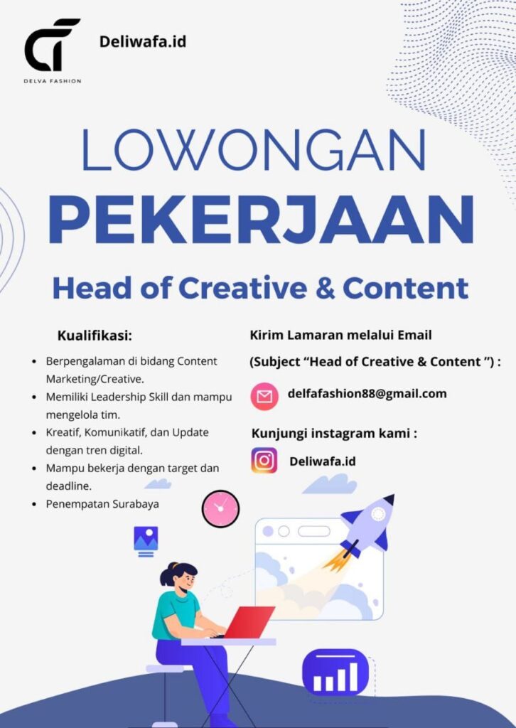 Deliwafa.id LOWONGAN PEKERJAAN Head of Creative & Content Kualifikasi: Berpengalaman di bidang Content Marketing/Creative. Memiliki Leadership Skill dan mampu mengelola tim. Kreatif, Komunikatif, dan Update dengan tren digital. Mampu bekerja dengan target dan deadline. Penempatan Surabaya Kirim Lamaran melalui Email (Subject “Head of Creative & Content “): [email protected] Kunjungi instagram kami : Deliwafa.id