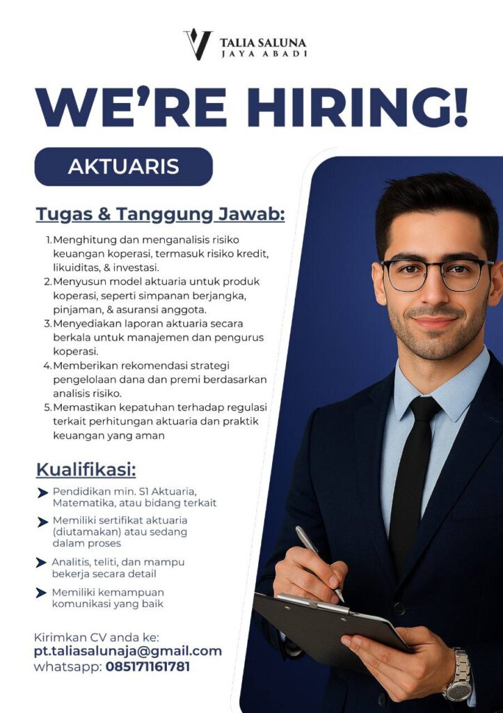 Memastikan kepatuhan terhadap regulasi terkait perhitungan aktuaria dan praktik keuangan yang aman Kualifikasi: ➤ Pendidikan min. S1 Aktuaria, Matematika, atau bidang terkait Memiliki sertifikat aktuaria (diutamakan) atau sedang dalam proses Analitis, teliti, dan mampu bekerja secara detail Memiliki kemampuan komunikasi yang baik Kirimkan CV anda ke: [email protected] whatsapp: 085171161781
