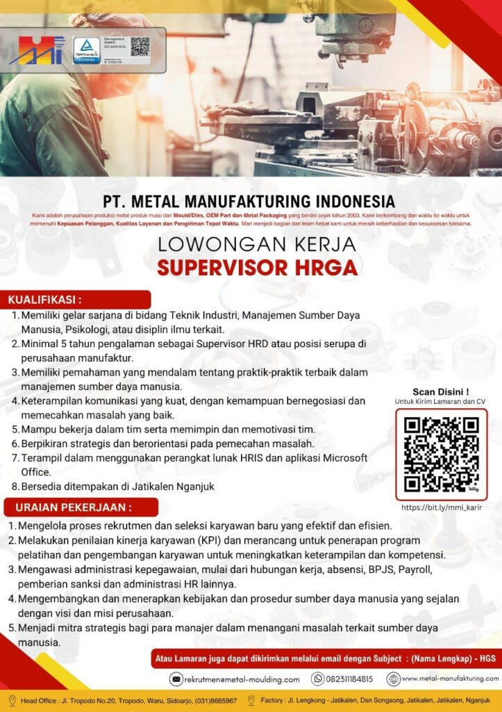 Menjadi mitra strategis bagi para manajer dalam menangani masalah terkait sumber daya manusia. Atau Lamaran juga dapat dikirimkan melalui email dengan Subject: (Nama Lengkap) – HGS [email protected] 082311184815 www.metal-manufakturing.com Head Office: Jl. Tropodo No 20, Tropodo, Waru, Sidoarjo, (031)8665967 Factory: Jl. Lengkong-Jatikalen, Dan Songsong, Jatikalen, Jatikalen, Nganjuk Scan Disini ! Untuk Kirim Lamaran dan CV https://bit.ly/mmi_karir