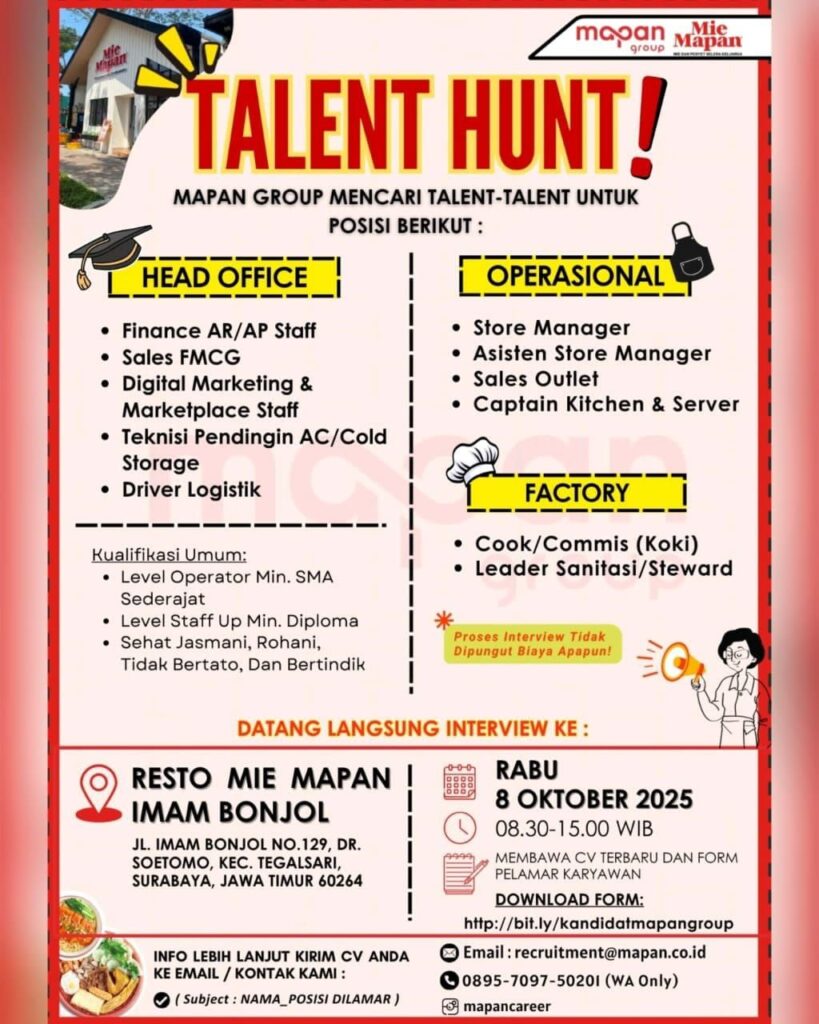 group TALENT HUNT! MAPAN GROUP MENCARI TALENT-TALENT UNTUK POSISI BERIKUT: HEAD OFFICE Finance AR/AP Staff Sales FMCG Digital Marketing & Marketplace Staff Teknisi Pendingin AC/Cold Storage Driver Logistik Kualifikasi Umum: Level Operator Min. SMA Sederajat Level Staff Up Min. Diploma Sehat Jasmani, Rohani, Tidak Bertato, Dan Bertindik RESTO MIE MAPAN I IMAM BONJOL JL. IMAM BONJOL NO.129, DR. SOETOMO, KEC. TEGALSARI, SURABAYA, JAWA TIMUR 60264 OPERASIONAL Store Manager Asisten Store Manager Sales Outlet Captain Kitchen & Server FACTORY Cook/Commis (Koki) Leader Sanitasi/Steward * Proses Interview Tidak Dipungut Biaya Apapun! DATANG LANGSUNG INTERVIEW KE: لهمها RABU 8 OKTOBER 2025 08.30-15.00 WIB MEMBAWA CV TERBARU DAN FORM PELAMAR KARYAWAN DOWNLOAD FORM: http://bit.ly/kandidatmapangroup INFO LEBIH LANJUT KIRIM CV ANDA KE EMAIL / KONTAK KAMI : (Subject: NAMA_POSISI DILAMAR) Email: [email protected] 0895-7097-50201 (WA Only) mapancareer
