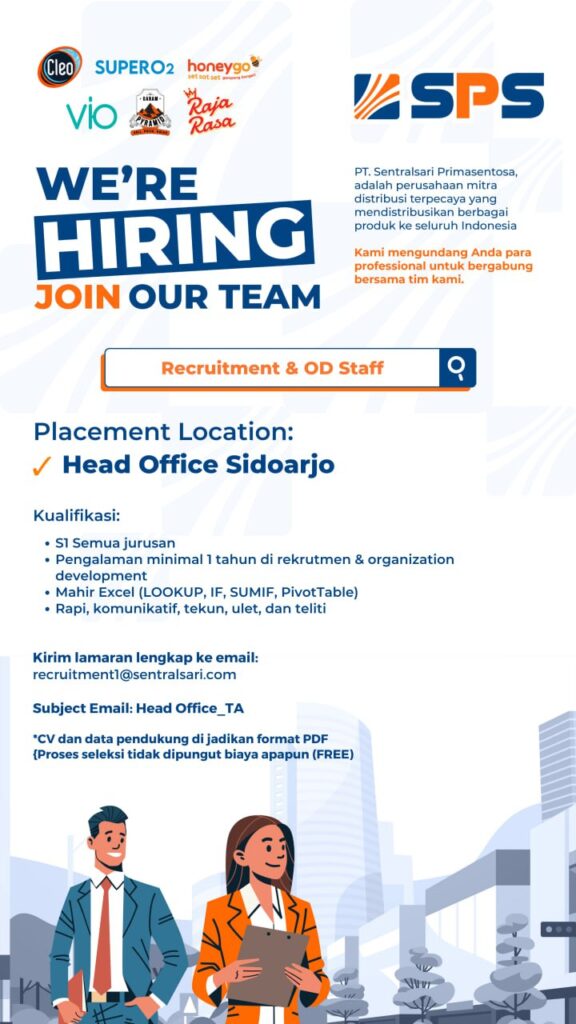 Cleo SUPERO2 honeygo vio Raja Rasa WE’RE HIRING JOIN OUR TEAM PT. Sentralsari Primasentosa, adalah perusahaan mitra distribusi terpecaya yang mendistribusikan berbagai produk ke seluruh Indonesia Kami mengundang Anda para professional untuk bergabung bersama tim kami. Recruitment & OD Staff Placement Location: Head Office Sidoarjo Kualifikasi: S1 Semua jurusan Pengalaman minimal 1 tahun di rekrutmen & organization development Mahir Excel (LOOKUP, IF, SUMIF, PivotTable) Rapi, komunikatif, tekun, ulet, dan teliti Kirim lamaran lengkap ke email: [email protected] Subject Email: Head Office_TA *CV dan data pendukung di jadikan format PDF (Proses seleksi tidak dipungut biaya apapun (FREE)