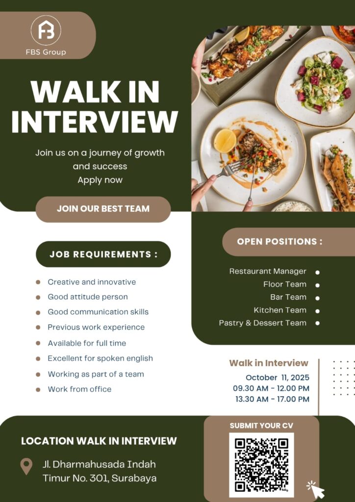 B WALK IN INTERVIEW Join us on a journey of growth and success Apply now JOIN OUR BEST TEAM JOB REQUIREMENTS: Creative and innovative Good attitude person Good communication skills Previous work experience Available for full time Excellent for spoken english Working as part of a team Work from office OPEN POSITIONS: Restaurant Manager Floor Team Bar Team Kitchen Team Pastry & Dessert Team Walk in Interview October 11, 2025 09.30 AM-12.00 PM 13.30 AM- 17.00 PM LOCATION WALK IN INTERVIEW Jl. Dharmahusada Indah Timur No. 301, Surabaya SUBMIT YOUR CV
