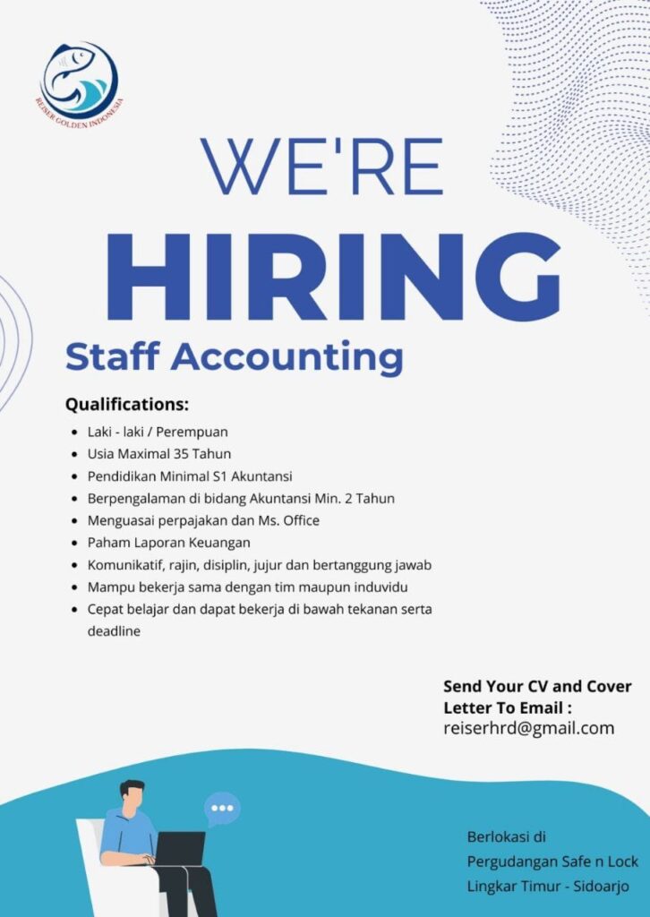 WE’RE HIRING Staff Accounting Qualifications: Laki-laki / Perempuan Usia Maximal 35 Tahun Pendidikan Minimal S1 Akuntansi Berpengalaman di bidang Akuntansi Min. 2 Tahun Menguasai perpajakan dan Ms. Office Paham Laporan Keuangan Komunikatif, rajin, disiplin, jujur dan bertanggung jawab Mampu bekerja sama dengan tim maupun induvidu Cepat belajar dan dapat bekerja di bawah tekanan serta deadline Send Your CV and Cover Letter To Email: [email protected] Berlokasi di Pergudangan Safe n Lock Lingkar Timur – Sidoarjo